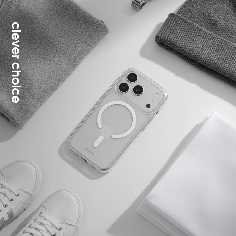 A clear, protective case for the iPhone 17 Pro Max with a built-in magnet for the MagSafe charger and accessories. A magnetic ring (comprising 39 smaller magnets) hidden in the hybrid shell ensures the charger and other MagSafe accessories fit perfectly to the phone every time.