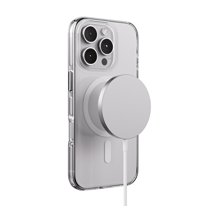 The Clear MAG Pro case is made entirely of ultra-transparent polycarbonate with a thickness of 2mm. Its minimalist design makes it almost impossible to feel in the hand, and the phone retains its elegant design without unnecessary thickening of the device. The metal buttons on the sides of the case also provide smoother clicks and volume control. Unlike regular MagSafe cases, the Clear MAG Pro case is equipped with high-power N52 magnets and an additional positioning magnet. Thanks to them, all MagSafe accessories adapt to your phone in a precise way. High-quality magnets also ensure that iPhone can be charged quickly and safely with MagSafe chargers (such as MagSpot Stand). Product Features: · Seamless polycarbonate construction · 2mm thick hardened PC plastic · High transparency from all sides · N52 magnets with high attraction power · Additional positioning magnet · Compatible with all MagSafe accessories · Metal buttons for smoother clicks · Raised camera bezel and display edge · Compatibility: Apple iPhone 16 Pro Max