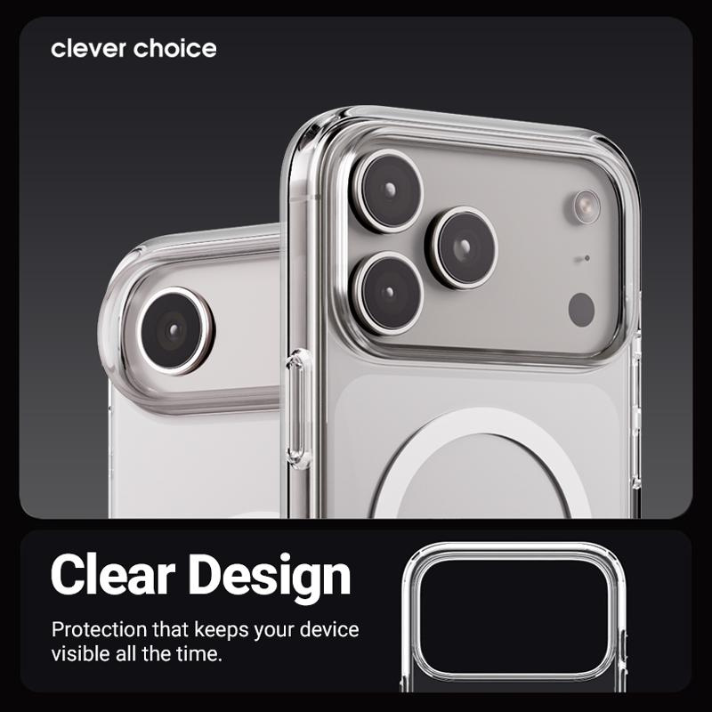 • Przezroczyste etui ochronne do iPhone’a 17 Az wbudowanym magnesem do ładowarki i akcesoriów MagSafe. Ukryty w hybrydowej powłoce pierścień magnetyczny (składający się z 39 mniejszych magnesów) sprawia, że ładowarka oraz pozostałe akcesoria MagSafe dopa