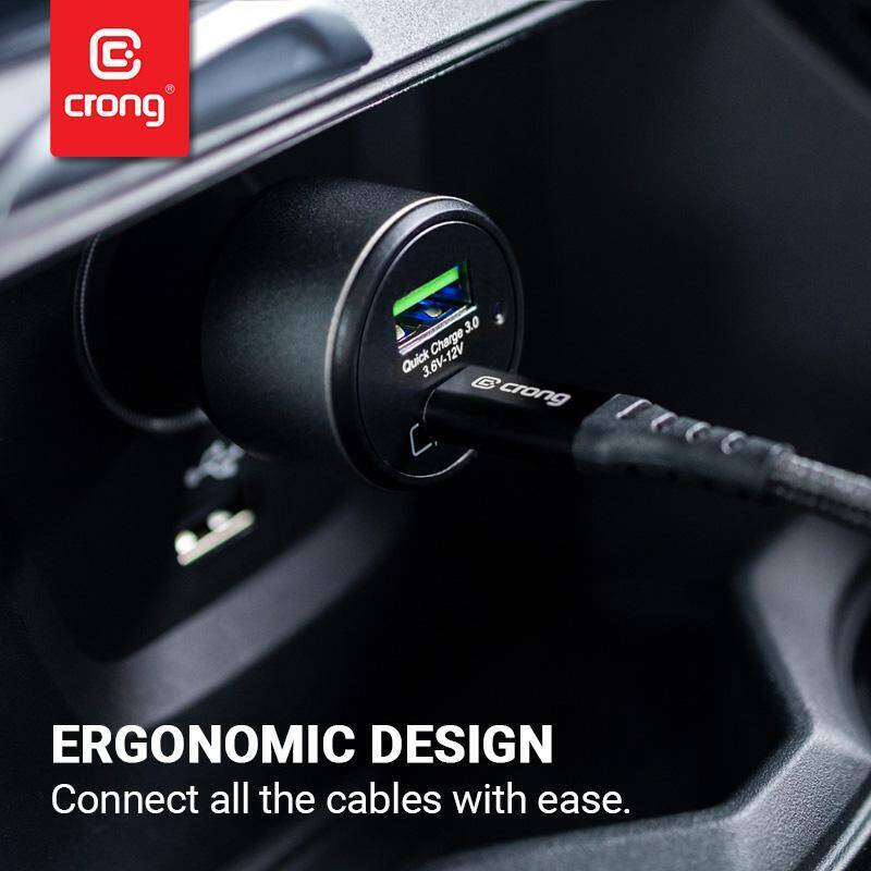 Ładowarka samochodowa Power Car Charger firmy Crong wyposażona została w ultraszybki port USB-C Power Delivery o mocy aż 45W oraz dodatkowy port USB-A Quick Charge 3.0 o mocy 18W.
